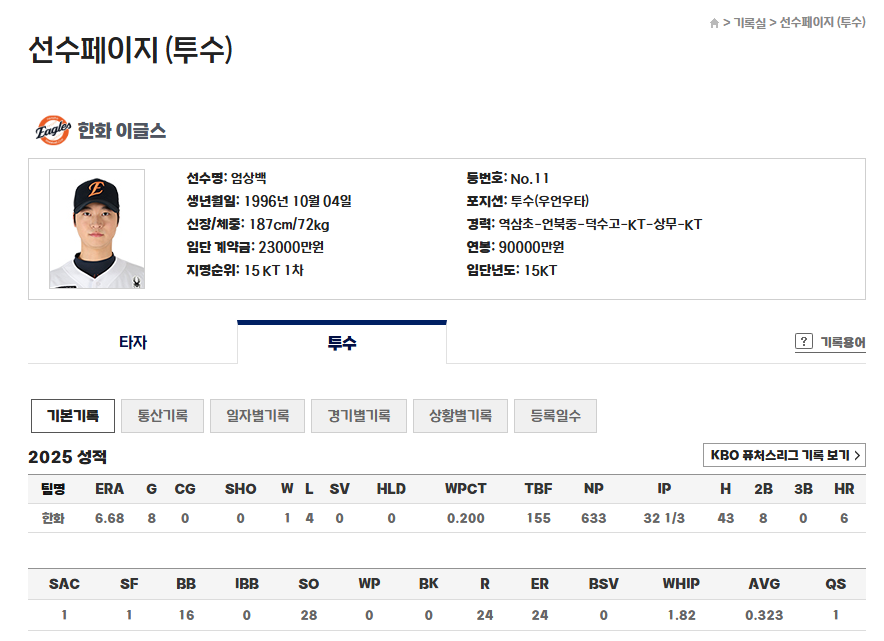 프로야구 한화 이글스가 2024년 FA 시장에서 78억원이라는 거액을 투자해 영입한 엄상백의 2025시즌 성적이 팬들의 기대에 미치지 못하고 있다. 한화가 올시즌 상위권 도약을 위해 과감한 투자를 단행했지만, 핵심 선발투수로 기대했던 엄상백의 부진이 팀 전력에 큰 영향을 미치고 있는 상황이다.